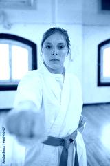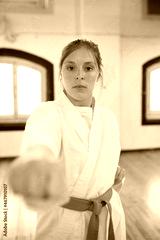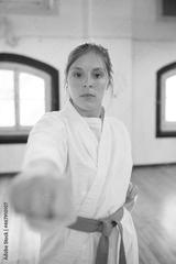 Portrait of serious young woman in combative position. Concentrated woman in white clothes punching fist in air, looking at camera. Sport, healthy lifestyle concept