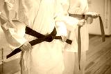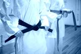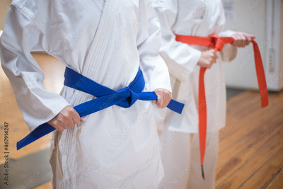 Close-up of white karate kimonos. Women in white clothes tying blue and red belts. Sport, healthy lifestyle concept