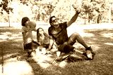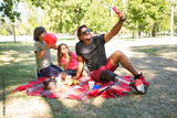 Happy father with disability taking selfie with kids on picnic. Man with mechanical leg with little boy and girl, holding phone, eating banana. Disability, family, love concept