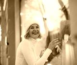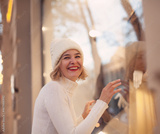 Portrait of a young beautiful woman next to a showcase of a clothing store