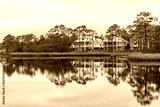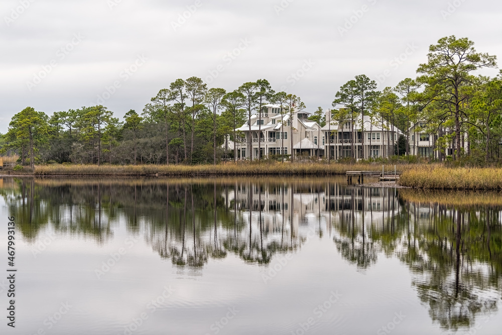 Western lake in Seaside, Florida Gulf of Mexico on cloudy day with lake house reflection and pine trees in winter