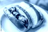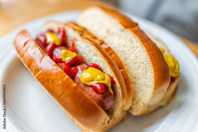 Hot dog sausage cooked prepared on brioche bun with ketchup and mustard condiments macro closeup showing detail and texture