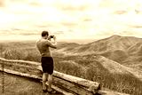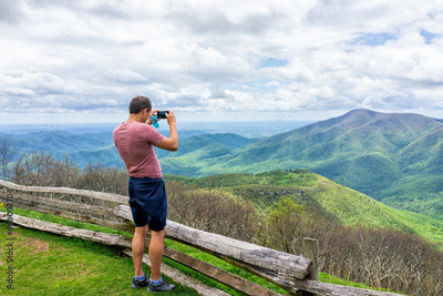 Devil's Knob overlook with man standing photographing taking picture of mountain view by wooden rustic countryside fence at Wintergreen resort town by Virginia Blue Ridge mountains