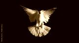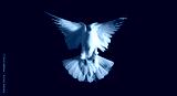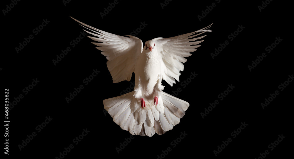 white dove spreading its wings flies on a black background