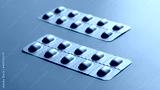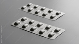 Two gray metallized blisters with medical pills or capsules on a gray background. Duotone. Aspect ratio 16 to 9