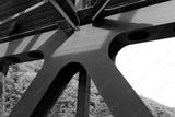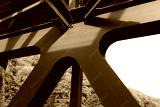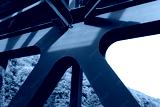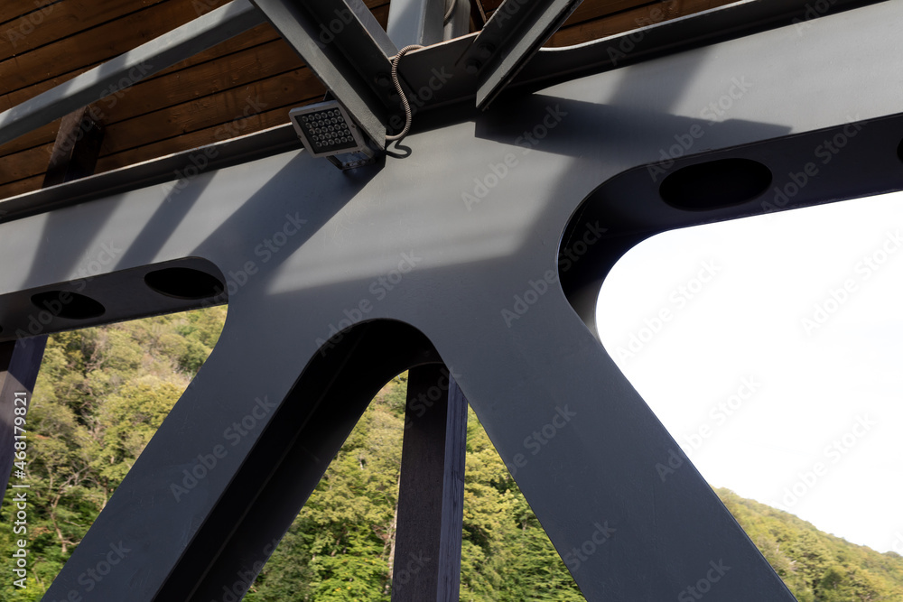 A fragment of a metal structure of a pedestrian crossing over a river or highway. Angular connection of several iron beams in one place. Close-up.