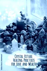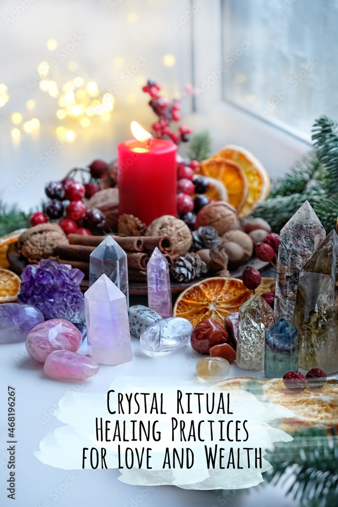 Christmas decoration and gemstones. Crystal Ritual: Healing Practices for Love and Wealth. energy healing minerals for esoteric, relax, life balance, witchcraft. Christmas, Magical Winter Solstice.