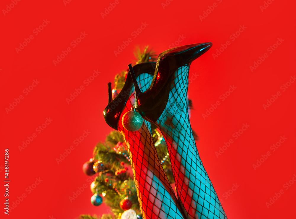 New year toy. Christmas ornaments. Long legs on high heels. Sexy female legs with Christmas toy. Beautiful legs.