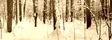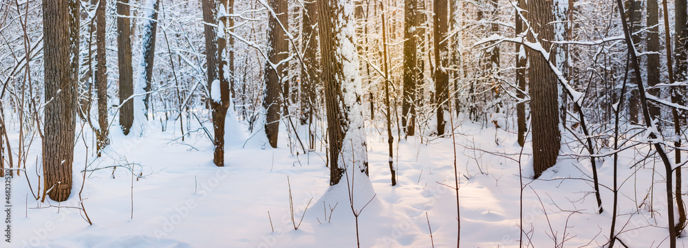 Beautiful panoramic scenery with winter forest and sun. Winter landscape with snowy trees