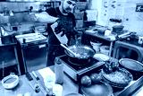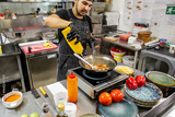 street food. fried noodles in a wok with chicken and shrimp on the wok.