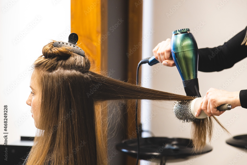 Master woman hairdresser dries the girl's hair with a hairdryer and combs after washing in the beauty salon