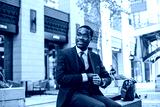 Portrait of black african american businessman in suit with glasses and headphones sits on the background of city buildings outdoors