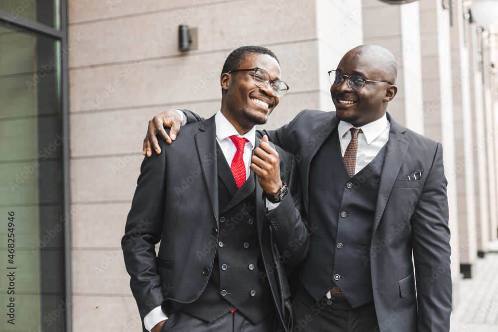 Portrait of two black African American businessman in suits outdoors. The joy of meeting good friends