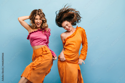 Beautiful caucasian young girls go crazy being photographed in studio. Blonde with open mouth in pink top and long skirt. Brunette waving her hair in orange dress with bare shoulder.