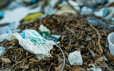 Used face mask discard in household garbage. Medical waste disposal with unhygienic management. Contaminated waste in community. Disposable earloop face mask waste garbage on floor. Coronavirus impact