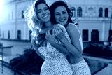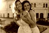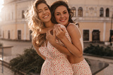 Lovely caucasian young brunette hugs her girlfriend from behind outdoors. Girls smiling with teeth, dressed in white summer clothes. Concept of enjoying weekend, vacation