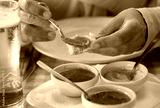 Focus on the hands of a Caucasian woman enjoying the food at the restaurant table tasting the three typical sauces of the Canary Islands, called "mojo"