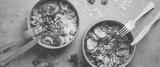 Japans poke bowl with seafood and salad and vegan bowl with vegetables and chickpeas in sustainable food container at grey background. Eco-friendly delivery food with plastic free cutlery. Top view.