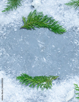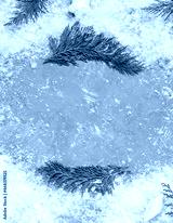 Christmas celebration concept frame with artificial snow and winter holiday decoration. Top view. Copy space