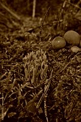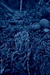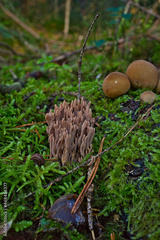 Coral mushroom called Ramaria formosa close-up, beautiful forest background