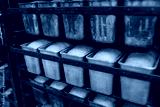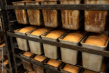 Fresh bread on a mobile rack with shelves. Bread cools down in the open air. Bread cools down in metal containers after baking. The stage of industrial baking