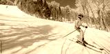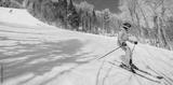 Skiing - People on ski. Alpine ski - skier looking at mountain view against snow covered trees Ski in winter on perfect powder snow enjoying nature landscape