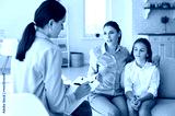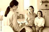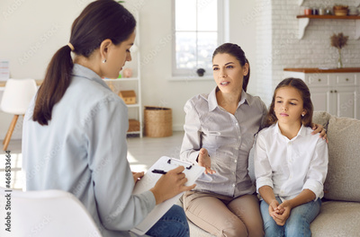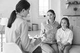 Parent sitting on sofa with preteen child and talking to counseling psychologist. Mother and therapist discuss behaviour problems, social interaction issues, ways to support kid in difficult situation