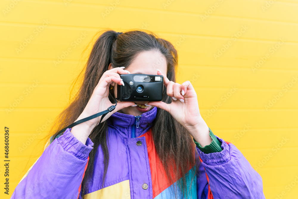 Hipster girl takes pictures with a film camera. Portrait of a young girl in a bright jacket near the yellow wall. Analog Shooting Camera, Fashion Styl