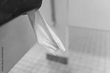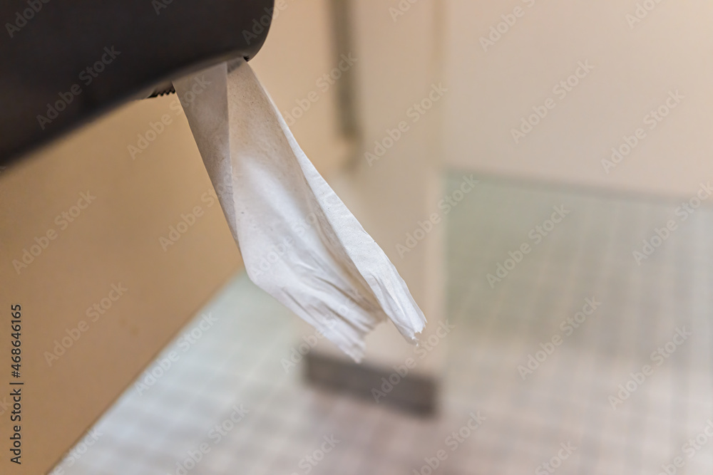 Clean bathroom interior with closeup of public restroom white toilet paper hanging with tissue rolls in stall