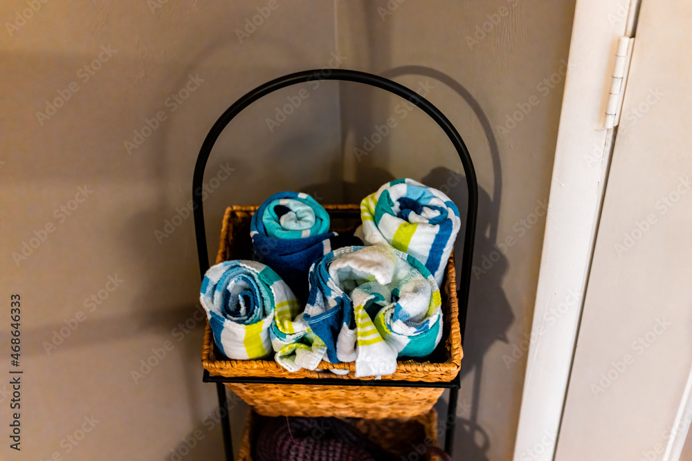 Rolls of folded colorful cotton beach towels rolls in wicker basket stand in home house room interior by wall door in corner