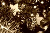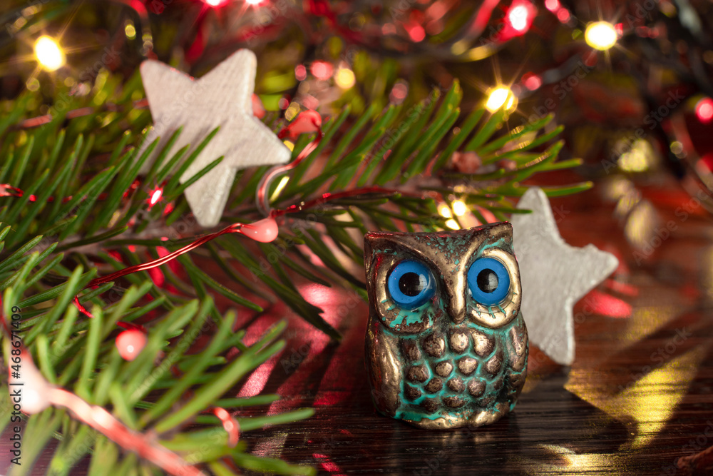 Metal souvenir owl next to a spruce branch with Christmas lights. New Year or Christmas composition