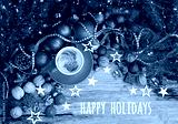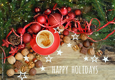 Happy holidays. Christmas decor, coffee cup, sweets, nuts on wooden table. Christmas and New Year holiday composition. Festive winter season. flat lay