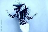 Photo of cute adorable young lady wear striped shirt dancing smiling isolated pink color background