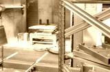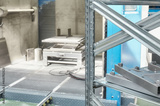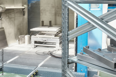 Welded parts on a shelf with welding chamber in background, selective focus.