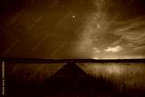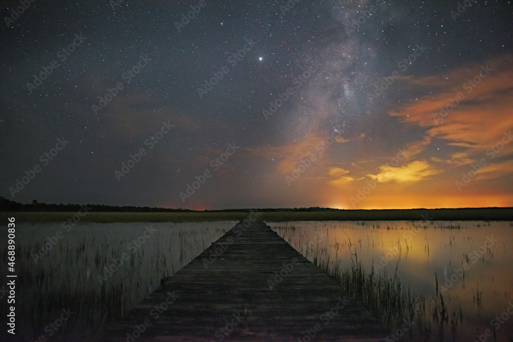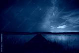 Beautiful view of the long wooden dock on the lake gleaming under the starry sky