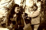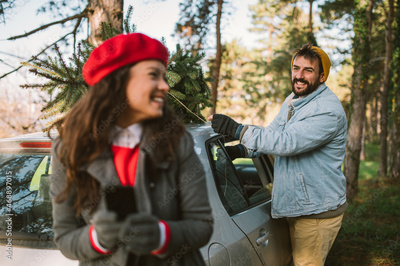 Beautiful young couple packing their christmas tree in the car going home to decorate it and taking a picture with their smartphone.