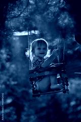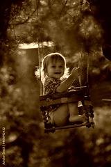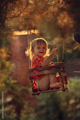 Cute baby girl is swinging on a wooden swing during the sunset. Image with selective focus and toning