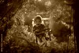Cute baby girl is swinging on a wooden swing during the sunset. Image with selective focus and toning