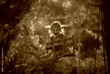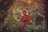 Cute baby girl is swinging on a wooden swing during the sunset. Image with selective focus and toning