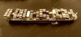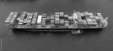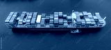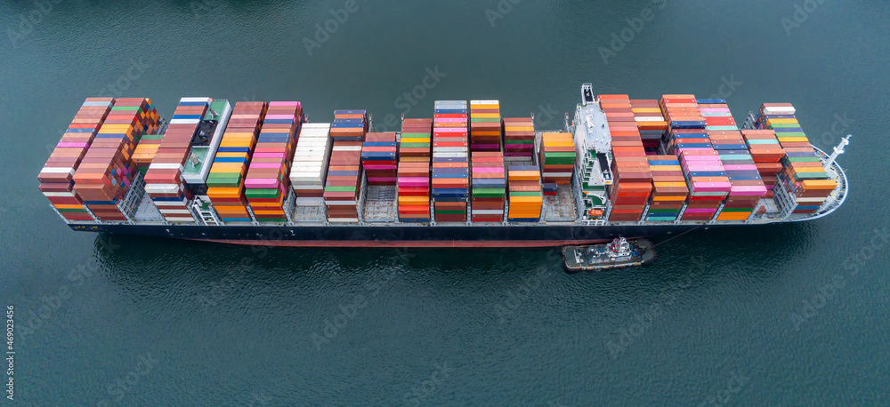Bird eye view transportation logistics and container dock cargo yard and cargo plane flying with working crane bridge in shipyard with transport logistic import export with blue sky background.
