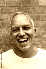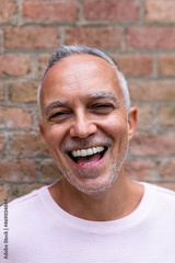 Caucasian adult man wearing pink sweater laughing looking at camera. Orange brick wall background. Vertical image.