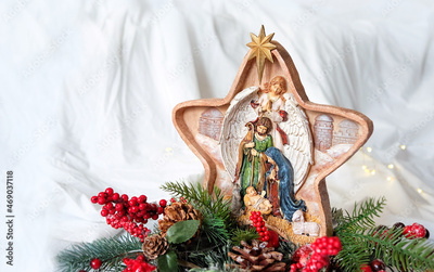 Beautiful traditional Christmas native scene and festive decorations, blurred light background. Star of Bethlehem, traditional symbol of Christmas holiday.