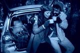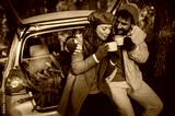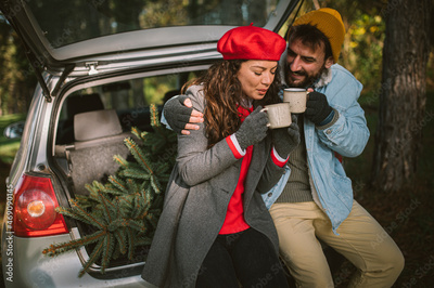 Happy young couple is sitting in their car and drinking hot coffee, after buying a Christmas tree
