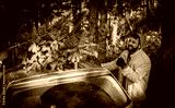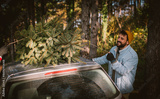 Lovely smiling couple has picked up the Christmas tree on a sunny December day, packing it up on the trunk of the car while flirting