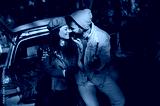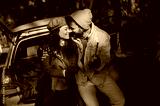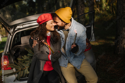 Beautiful young couple lighting sprinklers in the nature after they chose a christmas tree.
