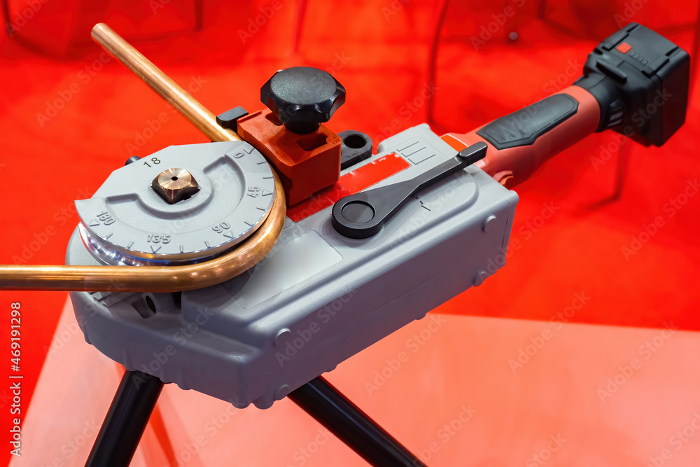 Mechanical pipe bender. Device for bending pipes. Equipment for production of copper tubes. Bending copper tube with equipment. Tools for installation of pipelines. Tube bending device