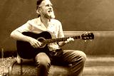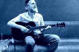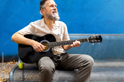 Mature adult caucasian man playing the guitar on a bench enjoying a sunny day.