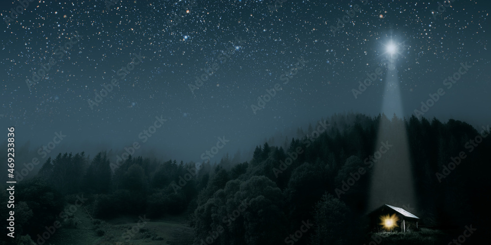 The star shines over the manger of christmas of Jesus Christ. panorama