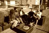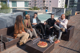 Positive business people on terrace roof party. Men and women in formal clothes sitting on rattan sofas around table with appetizers and champagne. Teambuilding, party concept