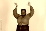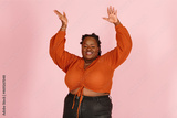 Excited young black plus size body positive woman with dreadlocks in orange top dances standing on light pink background in studio closeup